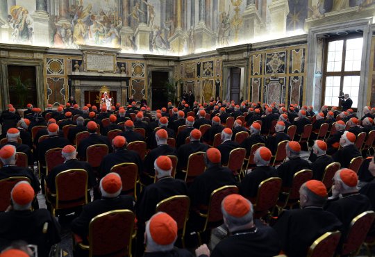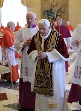 "Хорошо понимая серьезность этого акта, я при полной свободе заявляю, что отказываюсь от служения Римского епископа, Преемника Святого Петра, вверенного мне кардиналами 19 апреля 2005 года..."